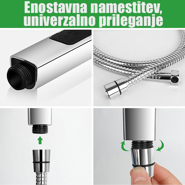 V nekaj sekundah se prilega kateri koli standardni cevi – brez orodja, brez težav. Inovativne silikonske šobe preprečujejo nabiranje vodnega kamna ter ohranjajo močen in enakomeren pretok vode.