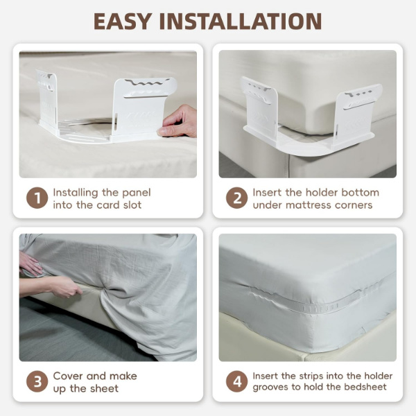 Pozabite na kovinske sponke ali plastične kavlje—ta sistem trakov tesno drži rjuhe od spodaj, ne glede na material ali velikost.