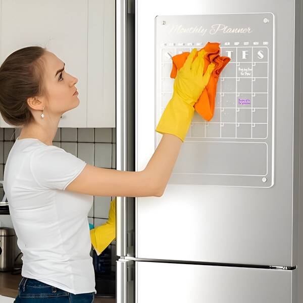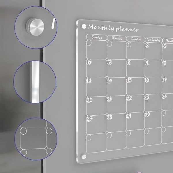 Njegova gladka, prozorna akrilna oblika ne doda le sodobnega pridiha vaši kuhinji, temveč ponuja tudi učinkovit način za upravljanje vaših vsakodnevnih dejavnosti.