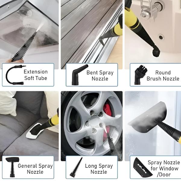 Vključuje krtače, šobe in blazinice za čiščenje tal, fug, oken in ostalega.