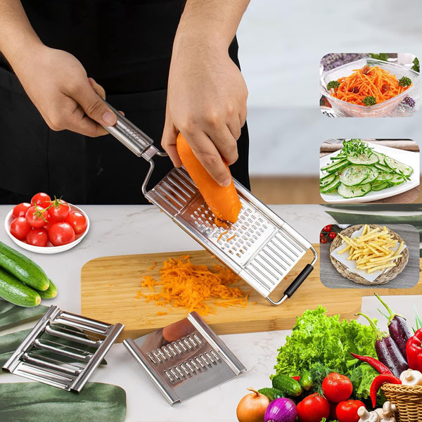 🧑‍🍳 Večnamenska zasnova: Režite, ribajte in sekljajte z enim orodjem—idealno za solate, pomfrit in hitre obroke.
